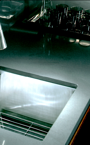 The distinctive bevelled edge of the 8 Degree sink creates a subtle tone contrast with the stainless steel basin for a striking visual effect. The bevelled detail also serves a practical role as the support for the accompanying wine glass drying rack that is supplied with this sink. The 8 Degree sinks are available in both a twin bowl and a single bowl model. A sound absorbing undercoat keeps these sinks quiet when in use and adds extra strength to the very durable 1.59 mm stainless steel.