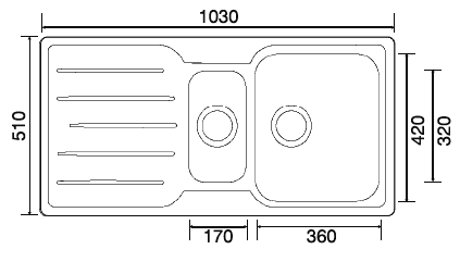 Installation: Topmount/Flushmount.png, Overall size: 1030/510 mm.png, Bowl size: 360/420/190 mm.png, Half bowl: 165/305/220 mm.png, Cut-Out size: 1010/490 mm.png, Minimum cabinet size: 600 mm.png, Waste included: 2 x 90 mm BSW & Connecting Kit.png, Tap-Holes: Reversible.png, Steel gauge: 1.0 mm