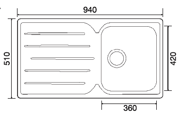 Installation: Topmount/Flushmount.png, Overall size: 940/510 mm.png, Bowl size: 360/420/220 mm.png, Cut-Out size: 920/490 mm.png, Minimum cabinet size: 450 mm.png, Waste included: 90 mm BSW.png, Tap-Holes: Reversible.png, Steel gauge: 1.0 mm