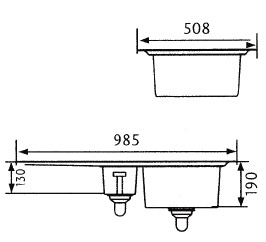 Installation: Topmount.png, Overall size: 985/508 mm.png, Bowl size: 340/420/190 mm.png, Half bowl: 160/350 mm.png, Cut-Out size: 965/488 mm.png, Minimum cabinet size: 600 mm.png, Waste included: 2 x 90mm BSW.png, and Connecting Kit.png, Tap-Holes: 1-Handed.png, Steel gauge: 0.9 mm