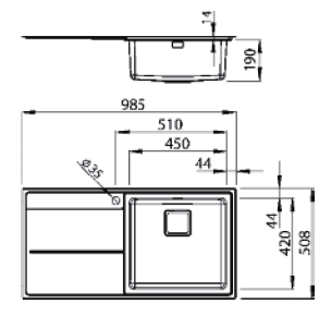 Installation: Topmount.png, Overall size: 985/508 mm.png, Bowl size: 450/420/190 mm.png, Cut-Out size: 965/488 mm.png, Minimum cabinet size: 600 mm.png, Waste included: 90mm BSW.png, Tap-Holes: 1-Handed.png, Steel gauge: 0.9 mm