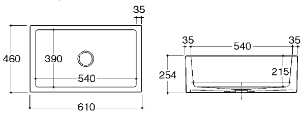 Installation:Apron Front.png, Overall size:610/460/254 mm.png, Bowl size:540/390/215 mm.png, Waste included: No.png, Overflow: No.png, Tap-Hole: No.png, Weight: 44kg