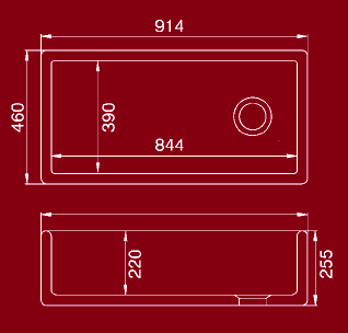 Installation: Apron Front.png, Overall: 914/460/255 mm.png, Bowl size: 844/390/220 mm.png, Overflow: Yes