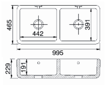 Installation: Apron Front.png, Overall size: 995/465/229 mm.png, Bowl sizes: 442/391/191 mm.png, Cabinet size: 1000 mm.png, Overflow: Yes