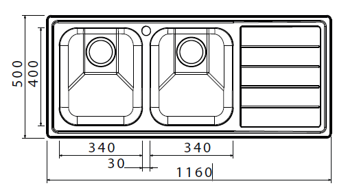 Installation: Topmount.png, Overall size: 1160/500.png, Bawl size: 340/400/210-mm.png, Cut-out size: 1140/480-mm.png, minimum cabinet size: 800-mm.png, Waste included: 90mm BSW.png, Tap Holes -: 1 Handed.png, Overflaw: Yes.png, Steel Gauge: 0.8-mm