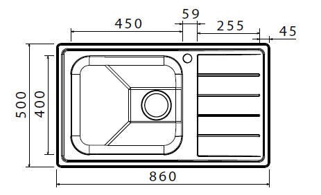 Installation: Topmount.png, Overall size: 860/500-mm.png, Bawl size:450/400/210-mm.png, Cut-out size: 840/480-mm.png, minimum cabinet size: 600-mm.png, Waste included: 90mm BSW.png, Tap Holes -: 1 Handed.png, Overflaw: Yes.png, Steel Gauge: 0.8-mm
