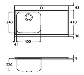 Installation: Topmount.png, Overall size: 897/510 mm.png, Bowl size: 400/340/220 mm.png, Cut-Out size: 850/480 mm.png, Minimum cabinet size: 500 mm.png, Waste included: 90mm BSW.png, Tap-Holes: 1-Handed.png, Steel gauge: 0.7 mm