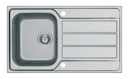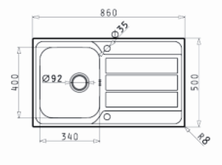 Installation: Flushmount/Topmount.png, Overall size: 860/500 mm.png, Bowl size: 340/400/180 mm.png, Cut-Out size: 840/480 mm.png, Minimum cabinet size: 450 mm.png, Waste included: 90mm BSW.png, Tap-Holes: Reversible.png, Steel gauge: 0.8 mm