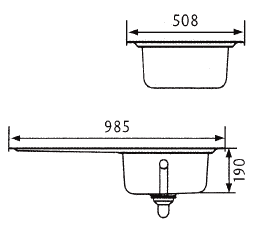 Installation: Topmount.png, Overall size: 985/508 mm.png, Bowl size: 450/420/190 mm.png, Cut-Out size: 965/488 mm.png, Minimum cabinet size: 600 mm.png, Waste included: 90mm BSW.png, Tap-Holes: 1-Handed.png, Steel gauge: 0.9 mm