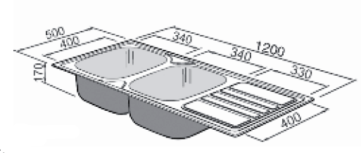 Installation: Topmount.png, Overall size: 1200/500 mm.png, Bowl sizes : 340/400/170 mm.png, Cut-Out size: 1176/476 mm.png, Minimum cabinet size: 800 mm.png, Waste included: 2 x 90mm BSW and Connecting Kit.png, Tap-Holes: 2-Reversible Steel gauge: 0.7 mm
