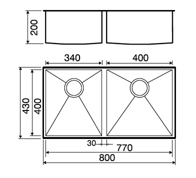 Installation: Undermount.png, Overall size: 430/800.png, Left Bawl: 340/400/200-mm.png, Right Bawl: 400/400/200.png, Minimum Cabinet Size: 1000-mm.png, Waste Included: 2 x 90-mm BSW & Connecting Kit.png, Tap-Holes: No.png, Steel Gauge: 1.2-mm